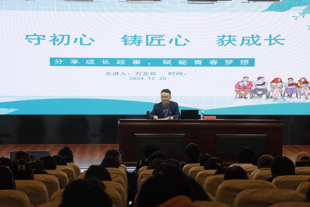 方文欢结合个人职业生涯成长经历,分享了从教过程中如何以童心理解学生、以责任心感染学生、以真心感动学生、以爱心温暖学生的感人事例,通过在平凡的工作岗位中不断接受挑战,不断突破自我的成长故事,激励同学们坚守教育初心,铸就教育匠心,实现个人成长。